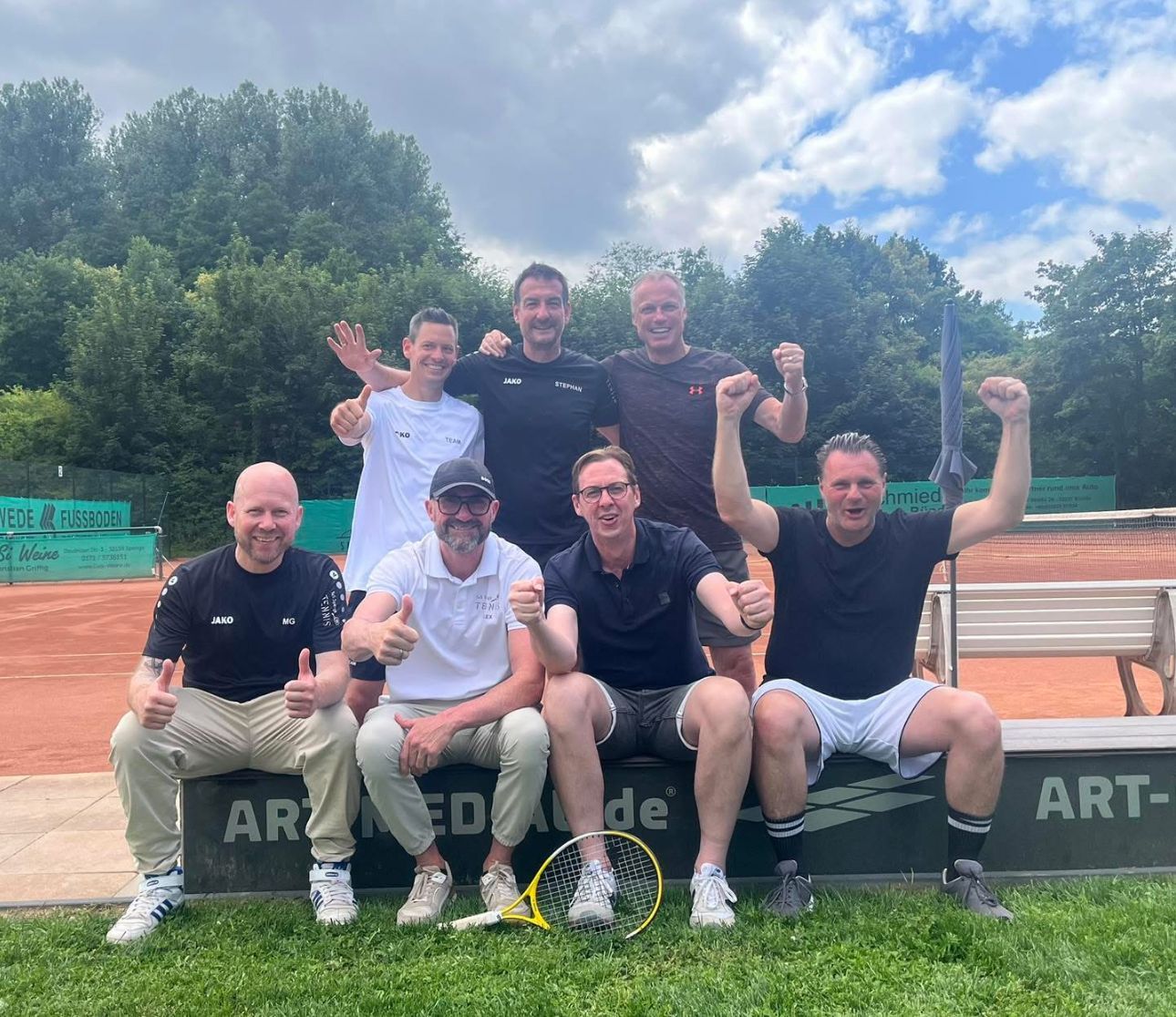 Liebe Tennisfreunde, noch einmal schlafen, dann steigt unser 50Jahresjubiläum. Der offizielle Teil mit den Festreden startet ab 13 Uhr. Vorher sind wir ab 10:30 Uhr aktiv mit den Vorbereitungen beschäftigt (Hüpfburg, Coffee Bike, Rednerpult, Buffet, etc.). Wir haben erfreuliche 60 Anmeldungen aus dem vereinsinternen Kreise plus ca. 30-40 zusätzliche Gäste anderer Vereine und insbesondere aus der Sponsorenwelt zu erwarten. Plant bitte genügend Zeit ein für die Bereitstellung Eurer mitgebrachten Essensachen im Clubhaus. Damit auch jede(r) satt wird, haben wir kurzfristig entschieden, den Grill anzuschmeißen. Der gemütliche Teil des Tages mit Essen & Musik beginnt dann nach den Festreden so ab ca. 14 Uhr. Und nun drückt uns allen die Daumen, dass die Sonne unser Fest freudig begleiten wird. In großer Vorfreude, beste Grüße vom JubiläumsTEAM